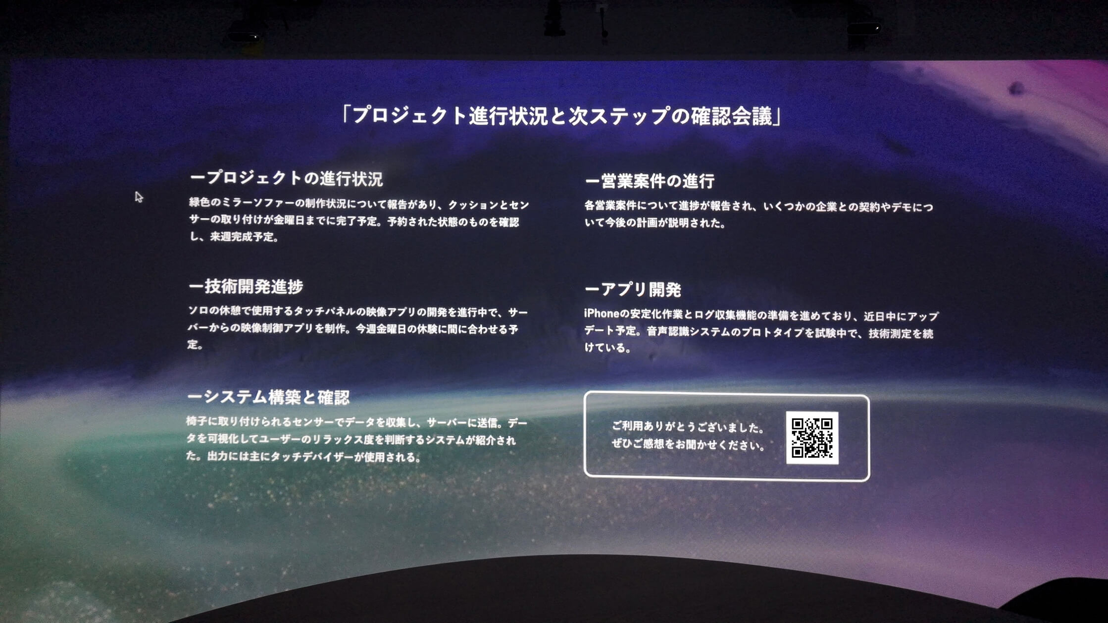 HOMEの投影エリアには余白があります。この余白には、空間内の発話や振る舞いを元に揺らぎと色味が制御された映像が生成されて流れます。